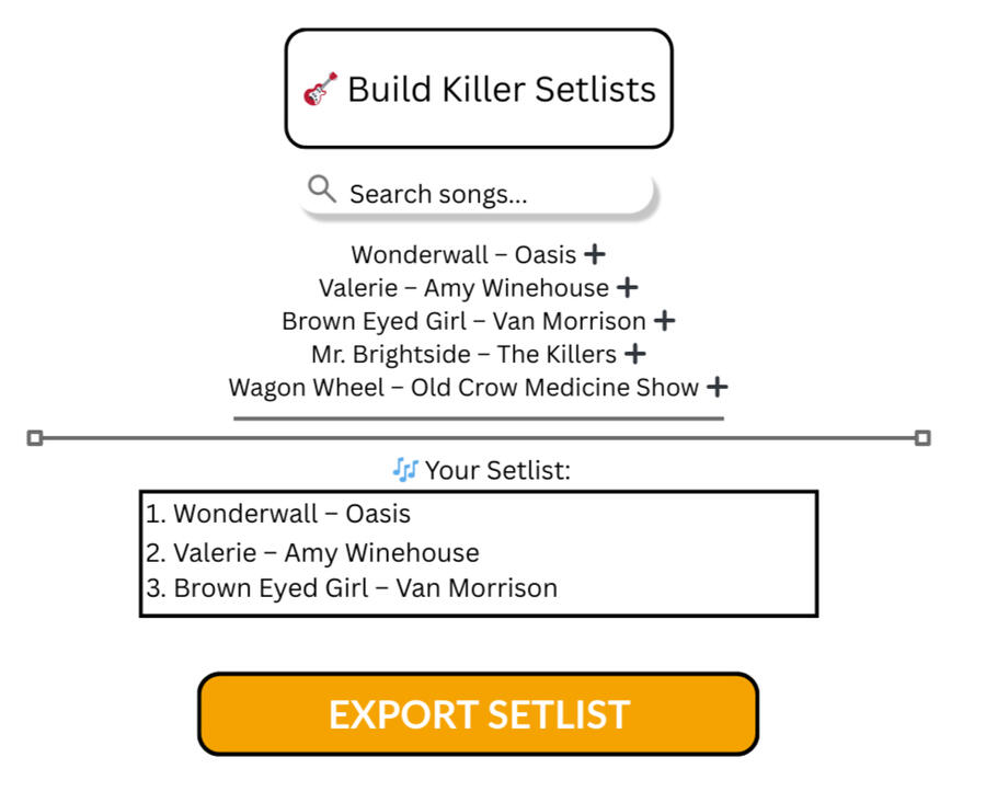"Search songs, add them to your setlist, export in one click. Perfect for cover bands, jam nights, and gigs."